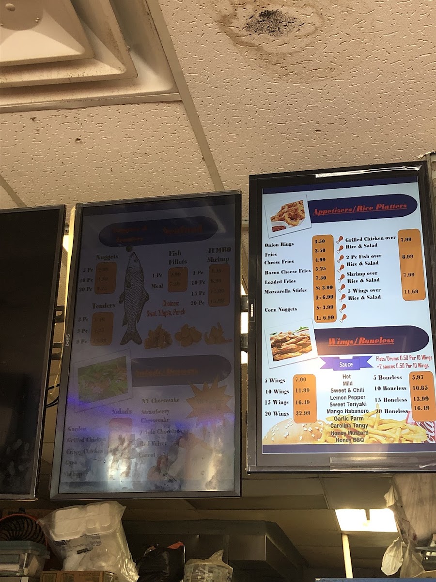 For those who prefer chicken in a different form, their Chicken Nuggets come in 5 for $5.99, 10 for $9.99, and 20 for $14.99, while Chicken Tenders are offered in portions of 3 pieces for $5.99, 5 pieces for $8.99, and 9 pieces for $13.99. If you're looking for something lighter, the Jumbo Shrimp can be enjoyed in servings of 5 for $7.99, 10 for $12.99, 15 for $17.99, or 20 for $21.99, and they also offer 2 pieces of Fish for $5.99.